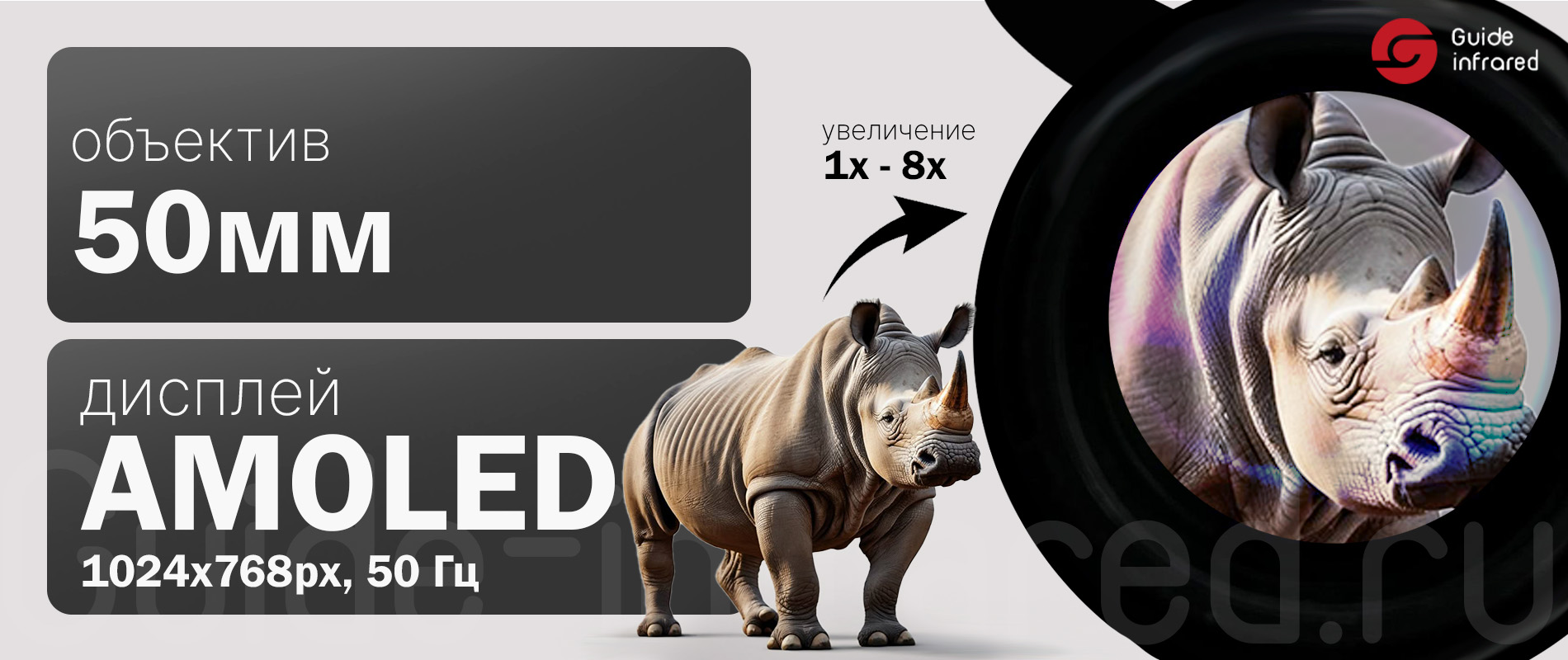 Прибор комплектуется качественным объективом F50мм/1,2 и парой OLED-экранов с разрешением 1024×768 пикселей в каждом из окуляров.